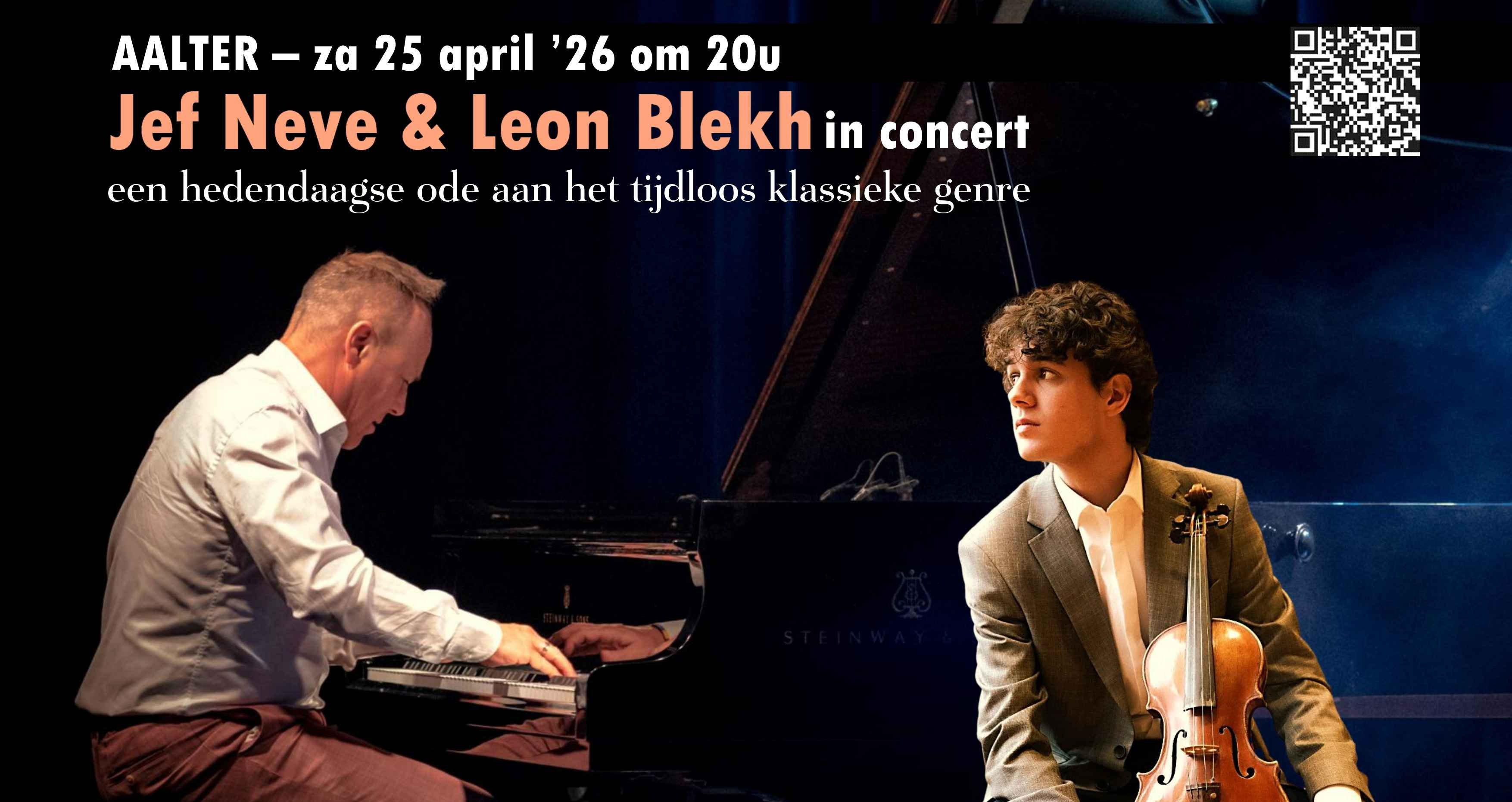 Duoconcert JEF NEVE & viool-virtuoos LEON BLEKH: zaterdag 25 april om 20u in Aalter. "Wanneer twee muzikale genieën connecteren, ontstaat er iets bijzonders.” "Een hedendaagse ode aan het tijdloos klassieke genre." Pianist Jef Neve en violist Leon Blekh kruisten elkaars pad in het orkest van Lorenzo Gatto. Dit werd een ontmoeting die de perfecte aanzet werd voor een intieme dialoog tussen piano en viool. Gedreven door een gedeelde liefde voor de kamermuziek, zoeken zij in dit duoproject naar een persoonlijke vertaling van het klassieke repertoire. Werken van grootmeesters als Beethoven en Brahms worden niet zomaar uitgevoerd, maar herademd – met respect voor het verleden en een open blik op het heden. In die geest ontstond ook iets unieks: een nieuwe sonate, speciaal gecomponeerd door Jef Neve voor dit duo. In deze compositie weerklinkt een diepe romantische ziel, maar ook speelse lichtheid en technische bravoure. Het resultaat is geen pastiche, maar een hedendaagse ode aan een tijdloos genre – een muzikale spiegel van Neves innerlijke wereld, gevangen tussen nostalgie en vernieuwing. Verwacht u aan het onverwachte: deze twee heren zorgen voor vuurwerk en diepe emoties tijdens hun concerten! Jef Neve (piano): www.jefneve.com Leon Blekh (viool): Leon Blekh is “Artist in Residence” aan de befaamde Koningin Elisabeth Muziekkapel in Waterloo en trad reeds op in enkele van de meest prestigieuze concertzalen van Europa. Hij speelde recent voor de Belgische Koninklijke Familie in het Koninklijk Paleis in Brussel. Hij werkte de afgelopen jaren samen met gerenommeerde orkesten zoals het Residentie Orkest, het Noord Nederlands Orkest, het Tbilisi State Symphony Orchestra en de Biel Solothurn Symphony Orchestra. Zijn indrukwekkende palmares omvat prijzen op toonaangevende concoursen in binnen- en buitenland zoals: Brueghel Concours, Oskar Back Vioolconcours. Windsor Festival, International String Competition. Leon speelde op vooraanstaande festivals zoals het Menuhin Festival, het Verbier Festival, het Delft Chamber Music Festival, het Puigcerdà Festival, het Arte Amanti Festival. Leon speelt op een Joseph Gagliano-viool uit 1793, beschikbaar gesteld door een anonieme sponsor.