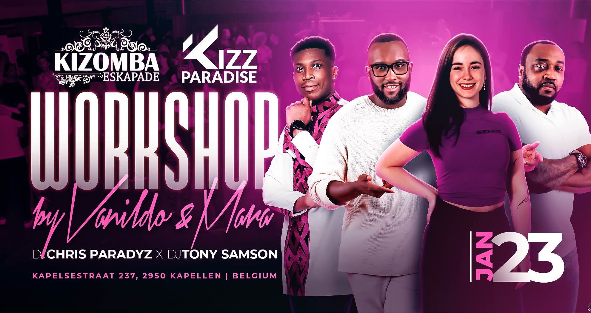 🌟🌟🌟 THE BEST KIZOMBA EVENT 🌟🌟🌟 ****************IN BELGIUM******************* ********************************************* ✨ WHY IS THIS EVENT THE BEST? ✨ Because… 🎧 We bring top DJs from NL, BE, LUX & FR. 💃 Every edition features a unique workshop by a specially selected instructor. 🕺 We invite professional taxi dancers from FR, NL & BE. 🏛 We’ve chosen the perfect venue for you. 🏛 WHY IS THE VENUE PERFECT? Because of: 🪩 Perfect dance floor so you can move with full confidence. 🔊 Professional sound system for crystal-clear, high-quality music. 💡 Professional lighting to make your moments shine. 📏 200 m² of dancing space. ❄ Air conditioning for your comfort all night. 🅿 Free parking exclusively for our guests. 🎽 Free vestiaire. 🚻 Free toilets. 📅 PRACTICAL DETAILS 🎵 DJ Line-up DJ Tony Samson DJ Chris Paradyz 🎟 Ticket Prices Party: €15 Full Pass (Workshop + Party): €25 At the door Party: €15 CASH only 📍 Location ESKAPADE Kapelsestraat 233, 2950 Antwerpen (Kapellen) 🅿 Free Parking at the venue 🕒 Time 21:00 – 22:00 Workshop by Vanildo & Mara 22:00 – 03:00 Party 🎟 Presale tickets: 💵 Drinks: Buy drink jetons at the venue (cash only) PS: By attending our classes/parties, you are supporting financially in this way orphans/children in need in Togo-Africa (Project of Kizz Paradise)