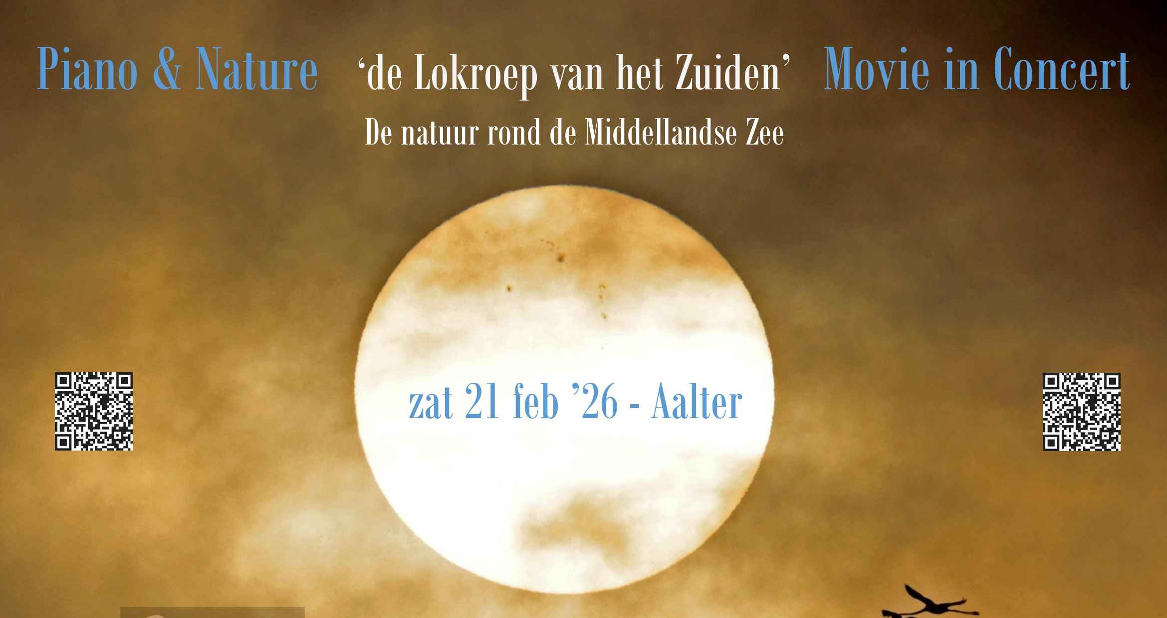 WAT? Movie in concert (live): natuurdocumentaire “de Lokroep van het Zuiden – de natuur rond de Middellandse Zee”, opgevoerd met een live piano soundtrack. “De Lokroep van het Zuiden” is een natuurdocumentaire gemaakt door Peter De Craene (natuurfotograaf) en Rudi Baetslé (natuurfilmer) over de natuurpracht rond de Middellandse Zee. Tijdens deze film, zal een live-soundtrack worden gebracht door Matthias De Jaeger (pianist-componist). Unieke zuiderse inspirerende natuurpracht, omarmd en verbeeld met sprekende muziek! TICKETS? Prijs: 20 EUR p.p. Tickets online via www.your-tickets.be/events/PianoNatureAalter of via mail info@natuurontmoetcultuur.be of via QR_CODE WANNEER? Zaterdag 21/02/26 om 20u 19u00: deuren + bar open. 20u00: start film + pianosoundtrack 21u30: open bar na afloop van de film WAAR? Aalter, Kapel Veilige Have (Lostraat 28, 9880 Aalter) WIE? Peter De Craene (natuurfotograaf) en Rudi Baetslé (natuurfilmer) www.natuurontmoetcultuur.be Matthias De Jaeger (pianist-componist): www.mdj-pianist.com Met dank aan: Quatre Mains Piano’s Natuurkijkers.be