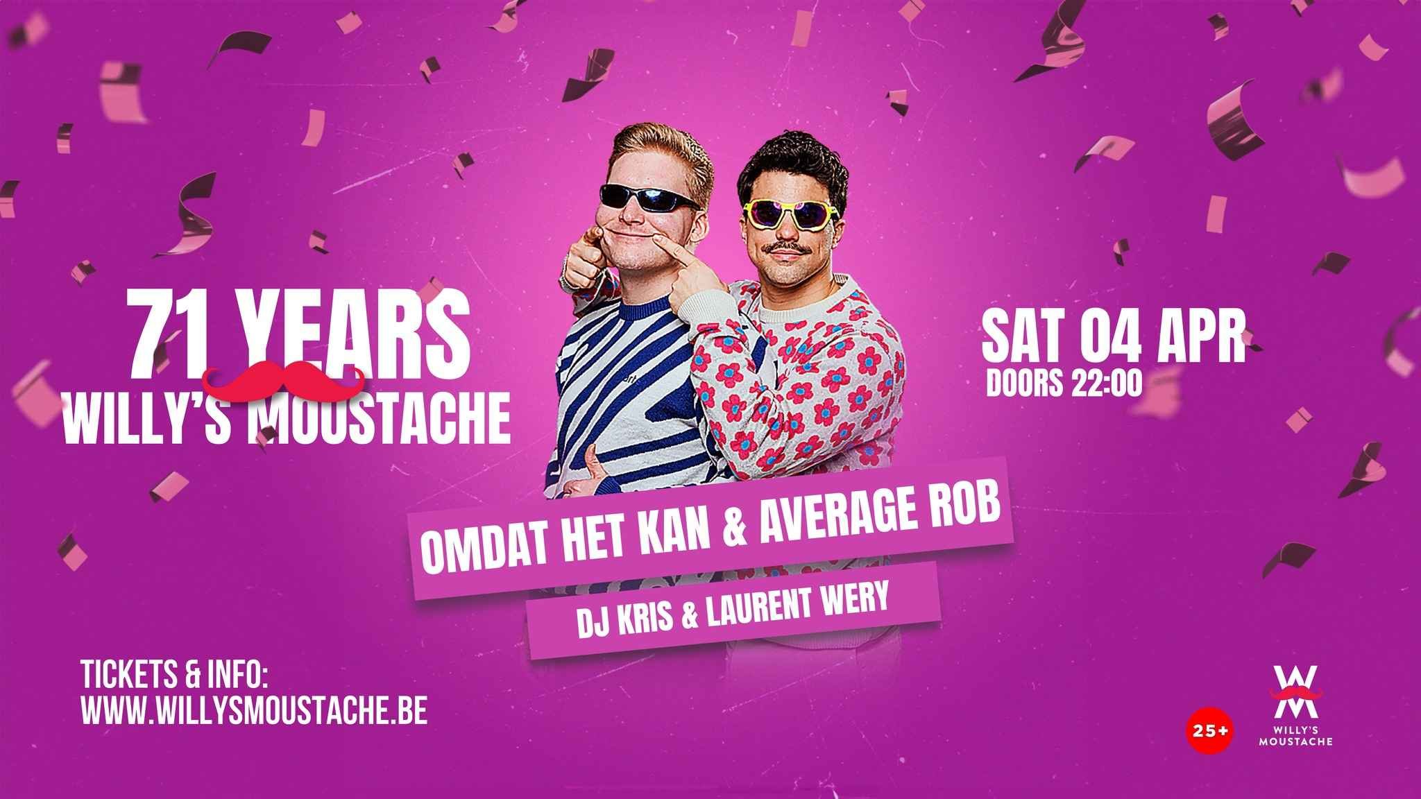 🎉 71 YEARS OF WILLY’S MOUSTACHE 🎉 🥸 Still classy. Still crazy. Still iconic. Willy’s Moustache is turning 71 – and we’re throwing a birthday bash that’s anything but ordinary. Expect glitter, confetti, guilty pleasures, and a dancefloor that refuses to behave 💃🕺 🔥 On the decks: 🎧 Omdat Het Kan & Average Rob – guaranteed chaos 🎶 DJ Kris & Laurent Wery – nonstop party anthems 📅 Saturday, April 4 🕙 Doors open at 22:00 🔞 25+ crowd only This isn’t just a party. It’s a celebration of legendary nights, iconic moustaches, and memories you might not fully remember 😏