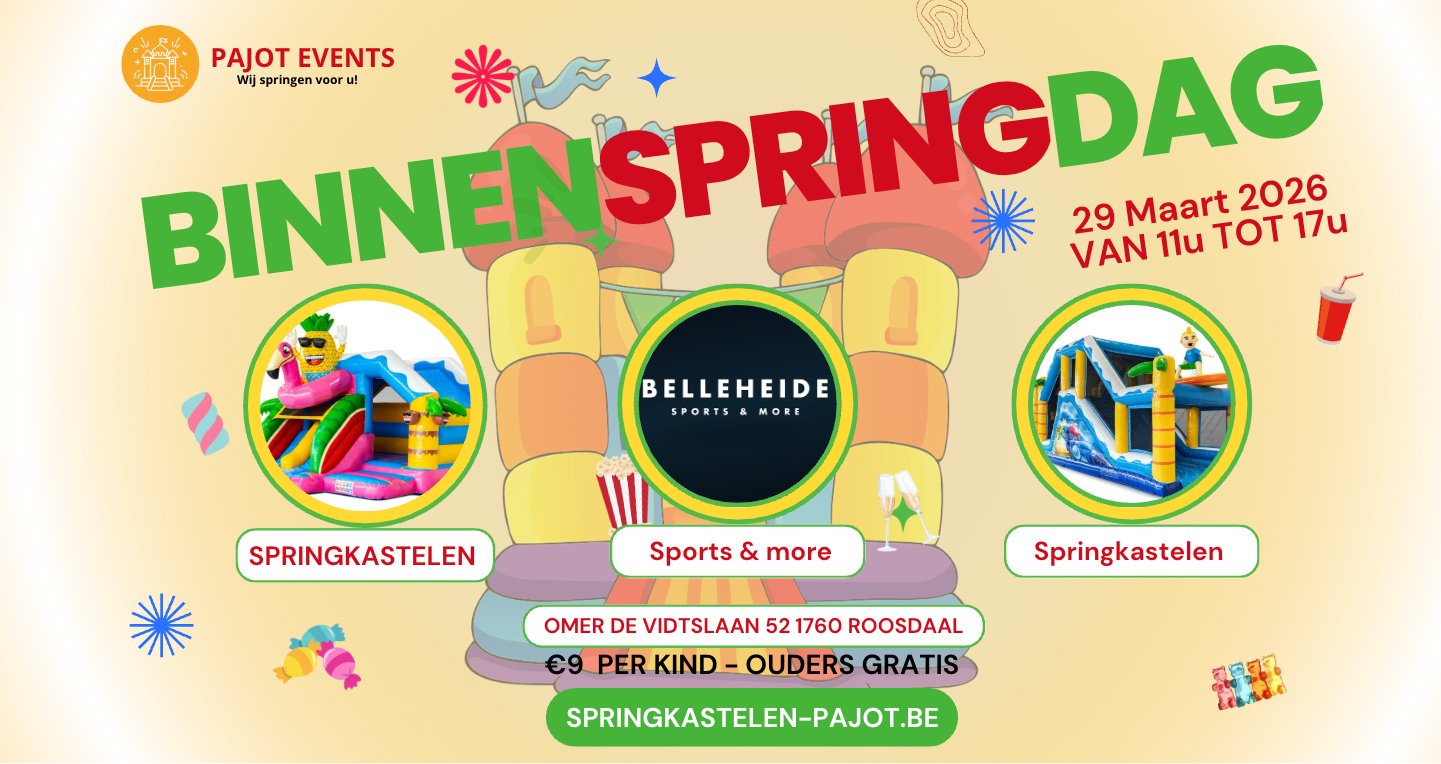 Welkom op onze binnenSPRINGdag! Voor deze feestelijke editie toveren we de sporthal van Belleheide opnieuw om tot een echt springparadijs. Kinderen kunnen zich volop uitleven op maar liefst 8 leuke en felgekleurde springkastelen in een veilige en overdekte omgeving. Terwijl de kinderen zich amuseren, kunnen jullie ook genieten van een hapje en een drankje. Ben je op zoek naar een leuke namiddag met de kids? Schrijf je dan snel in en kom mee genieten van een dag vol springplezier, lachen en energie!