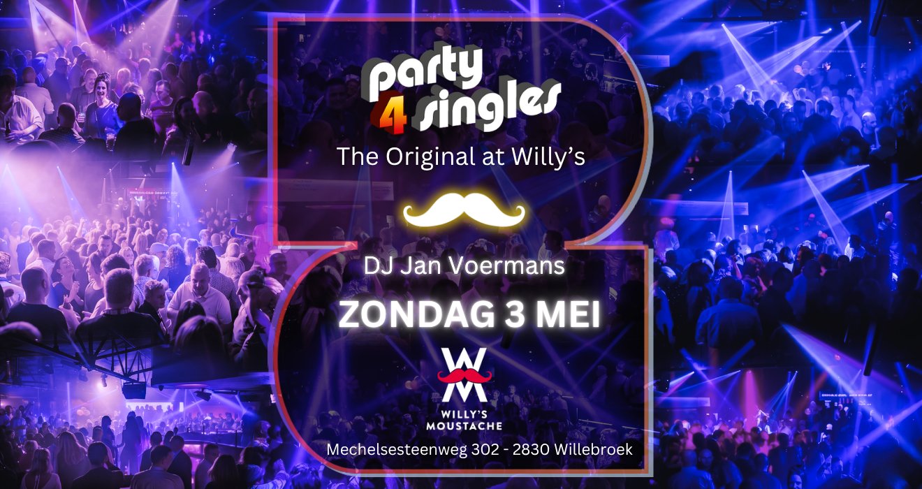 𝐏𝐚𝐫𝐭𝐲𝟒𝐬𝐢𝐧𝐠𝐥𝐞𝐬 - 𝐓𝐡𝐞 𝐎𝐫𝐢𝐠𝐢𝐧𝐚𝐥 𝐚𝐭 𝐖𝐢𝐥𝐥𝐲'𝐬 Zondag 3 mei - 19u Na een fantastische XL-editie keren we op zondag 3 mei terug naar Willy’s Moustache voor een bijzondere editie van Party4singles. Met 𝐃𝐉 𝐉𝐚𝐧 𝐕𝐨𝐞𝐫𝐦𝐚𝐧𝐬, het originele team en de vertrouwde sfeer op de dansvloer belooft dit opnieuw een avond te worden die je niet wilt missen. - Attentie voor de eerste 200 bezoekers - Start om 19u tot 24u - Verzorgde looks & positieve vibes gewenst LOCATIE: Willy's Moustache - Mechelsesteenweg 302 - Willebroek - Kom op tijd voor de beste plaatsen