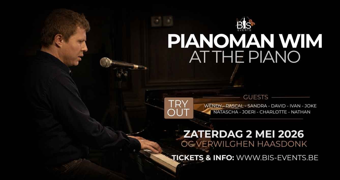 Wim De Bock, beter bekend als Pianoman Wim, is al jaren een vaste waarde in Beveren en ver daarbuiten. De blinde pianist raakte bekend in heel showbizzland en bracht onlangs zijn eerste full album uit: een prachtige verzameling songs, ingespeeld samen met tal van sterke vocalisten uit de buurt. En toen dachten wij: zo'n mooi concept moet je live kunnen beleven. Met veel trots mogen we daarom het allereerste try-out concert van Pianoman Wim: at the piano aankondigen! Tijdens deze unieke avond kruipt Wim achter de piano en brengt hij meerdere vocalisten van het album mee op het podium. Verwacht pure emoties, warme stemmen en muzikale klasse, gedragen door het pianospel van Wim.